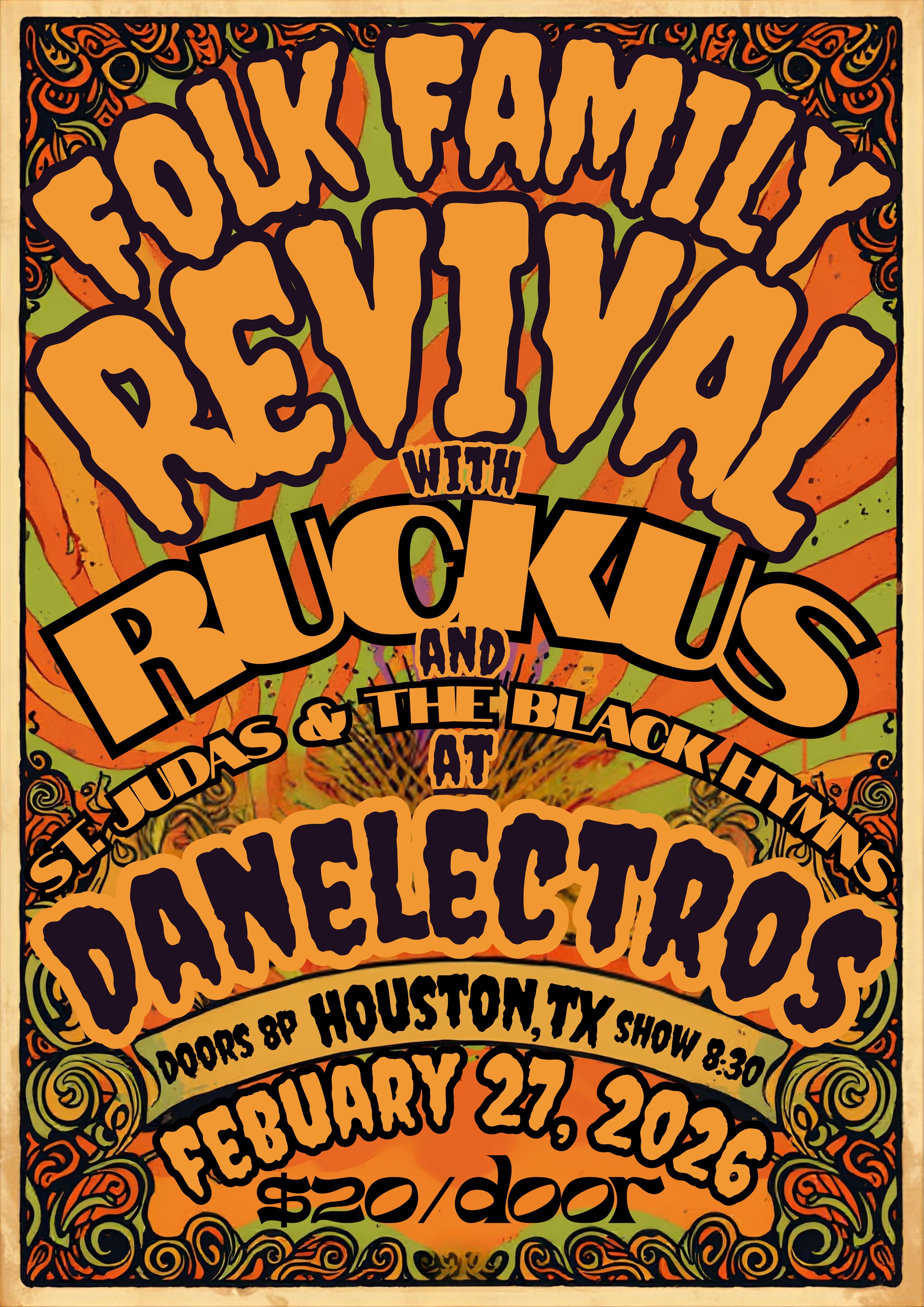 The brothers from Folk Family Revival are bringing their music, their cult like fans (The funnest people in the South) to the Heights to play all night downstairs and upstairs at Dan Electros. This is a must see show with a killer line up. Starting off the night check out St Judas & the Black Hymns which is a must see new band in the Houston scene and then we have local legends Ruckus playing afterwards. There is also talks of a picking party upstairs til 2 am after the FFR set. Don't miss this show!